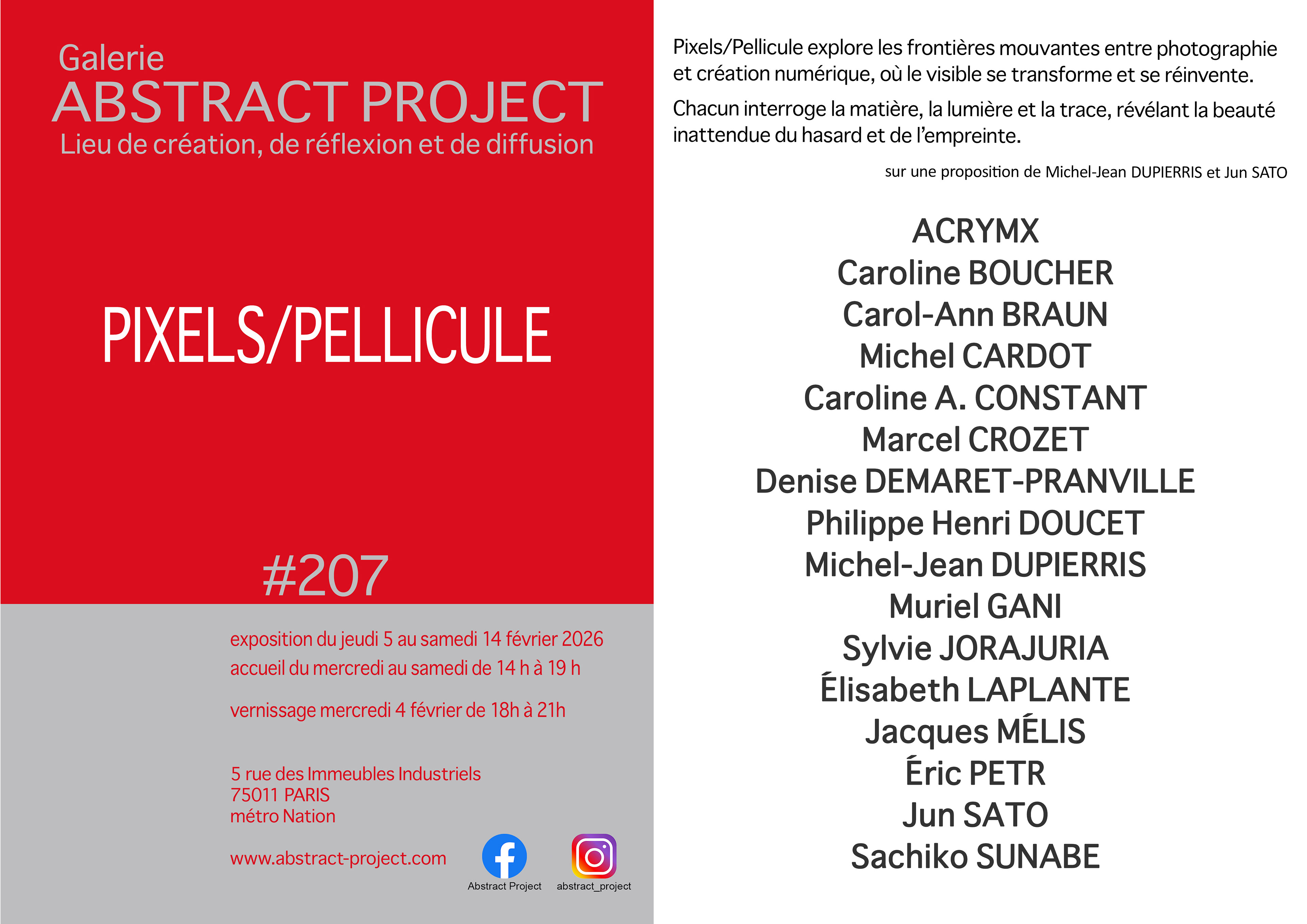 J'ai le plaisir de participer à la prochaine exposition PIXELS/PELLICULE qui se tiendra du 5 au 14 février 2026 à la Galerie Abstract Project (Espace des arts abstraits), située au 5 rue des Immeubles Industriels, 75011 Paris.